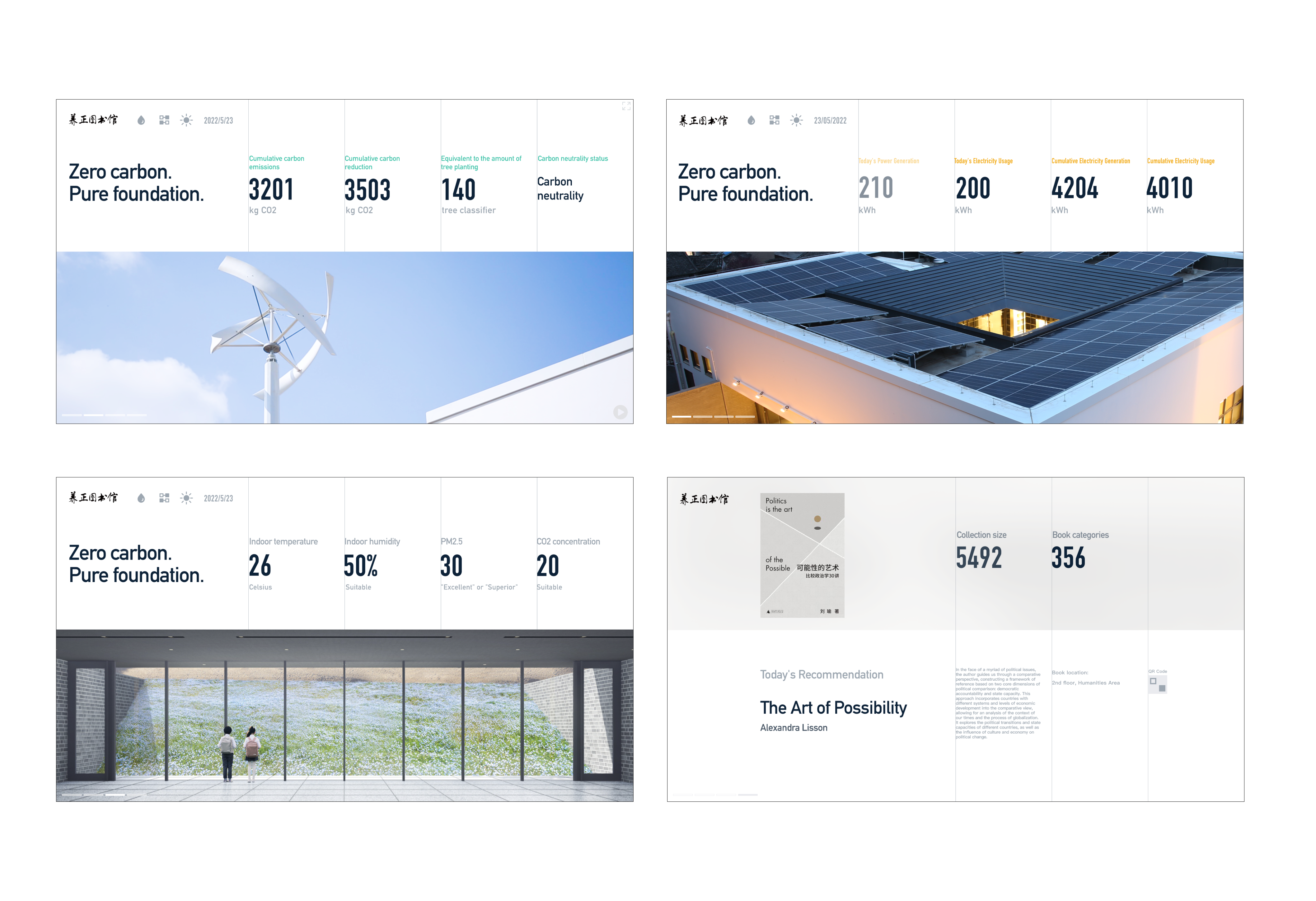 Designing a visual dashboard system for a zero-carbon library. The building is fully self-sufficient, generating and managing its own energy through renewable sources.